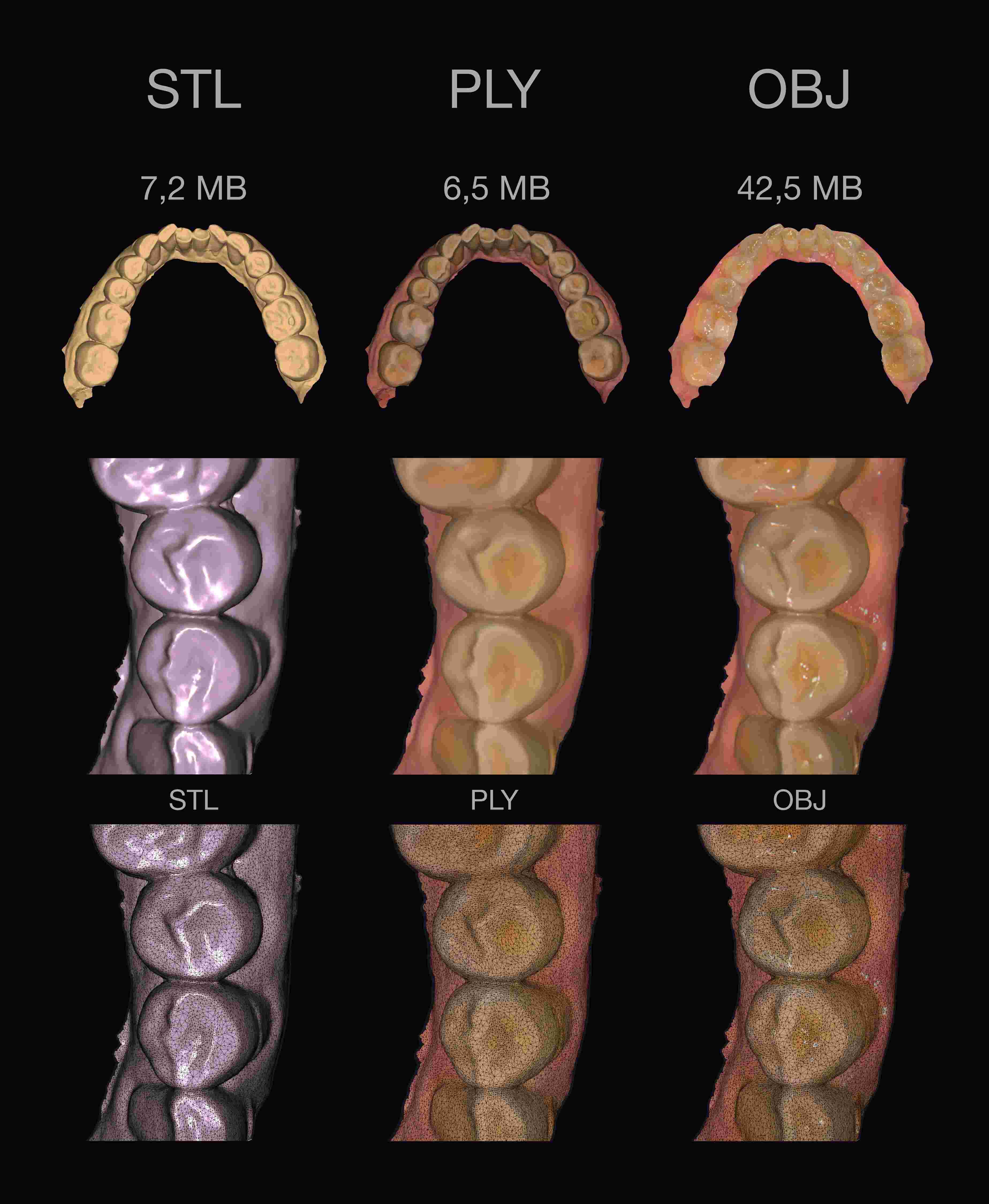 - Additional data (such as color) can be stored for each vertex. This allows for a more realistic representation of tooth color, soft tissues, and surface details compared to STL.
